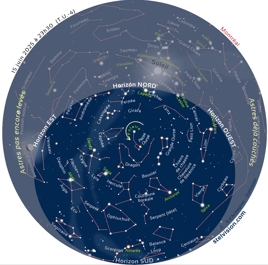 La carte ci-dessous présente le ciel tel qu'on pourra l'observer en soirée en juin 2025.