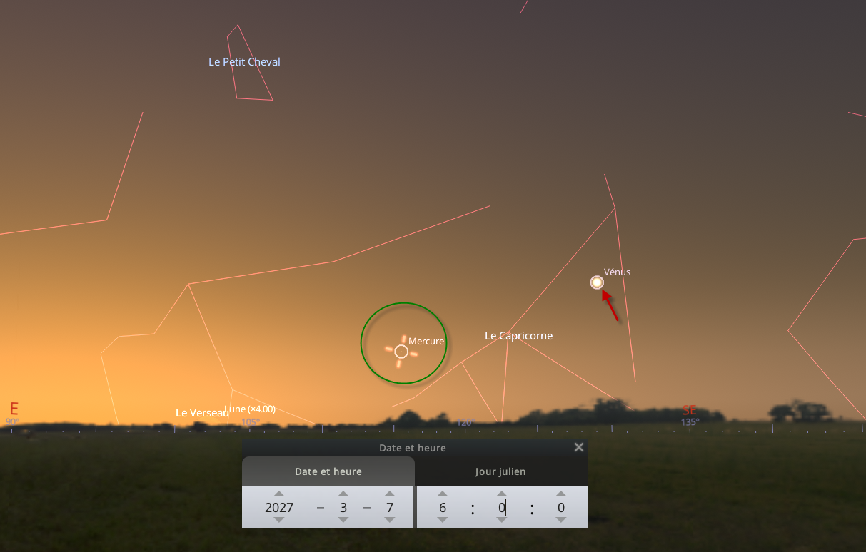 Plus haute altitude de Mercure le matin. dimanche 7 mars 2027 6 h 00 a.m. 6 h 30 a.m. 06 h 00 06 h 30 Société d'astronomie du Planétarium de Montréal 4801 Avenue Pierre-De Coubertin Montréal, QC, H1V 3V4 Canada (carte) Google Agenda ICS Le 7 mars, Mercure atteindra son point culminant dans le du matin de février avec une magnitude de 0,1. Malheureusement cette apparition est peu visible et très difficile à observer. Mercure culminera à 9° au-dessus de l'horizon au lever du soleil. Voir en taille réelle