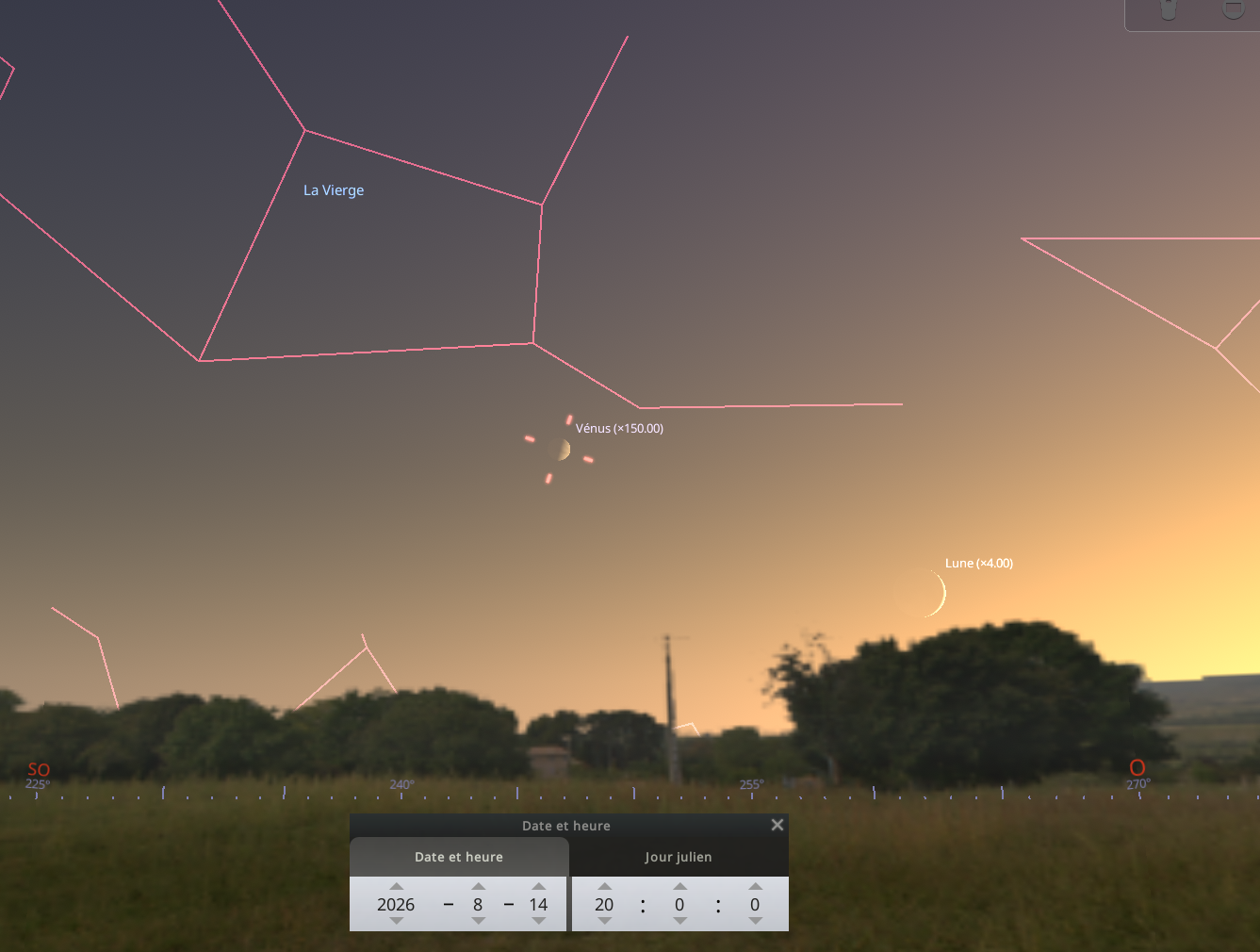 Le vendredi 14 aout après le coucher du Soleil, c’est la plus longue élongation Est (soir) de Vénus.