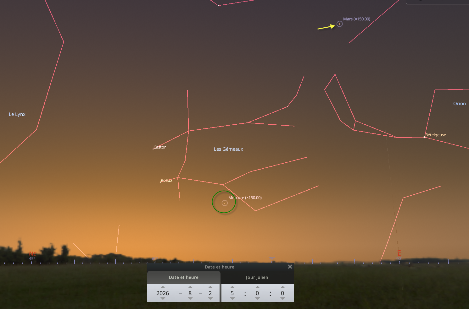 Le dimanche 2 aout avant le lever du Soleil, c’est la plus longue élongation Ouest (matin) de Mercure pour une valeur de 19o. Mercure atteindra sa plus grande séparation du Soleil dans son apparition matinal de juillet-Aout 2026, elle brillera à une magnitude de 0.0.