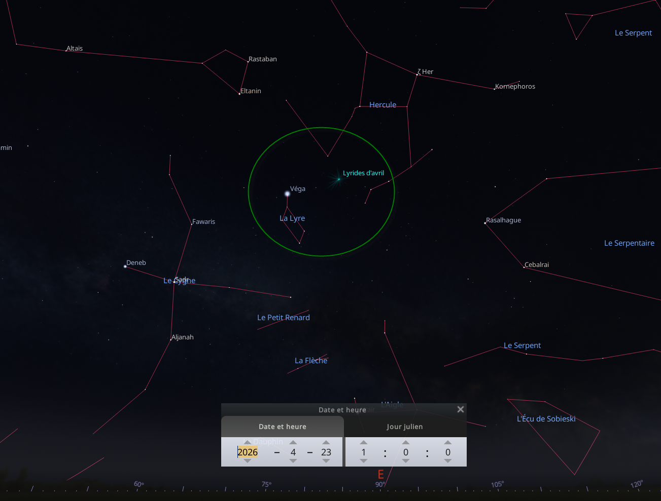 La pluie d’étoiles filantes les Lyrides, proviennent de la comète C/1861 G1 Thacher. Cette pluie peut être observée du 16 au 25 avril, mais le maximum se situe dans la nuit du 22 au 23 avril. La Lune étant dans le premier quartier, sa brillance devrait ne pas trop nuire à l’observation de la pluie d’étoiles.