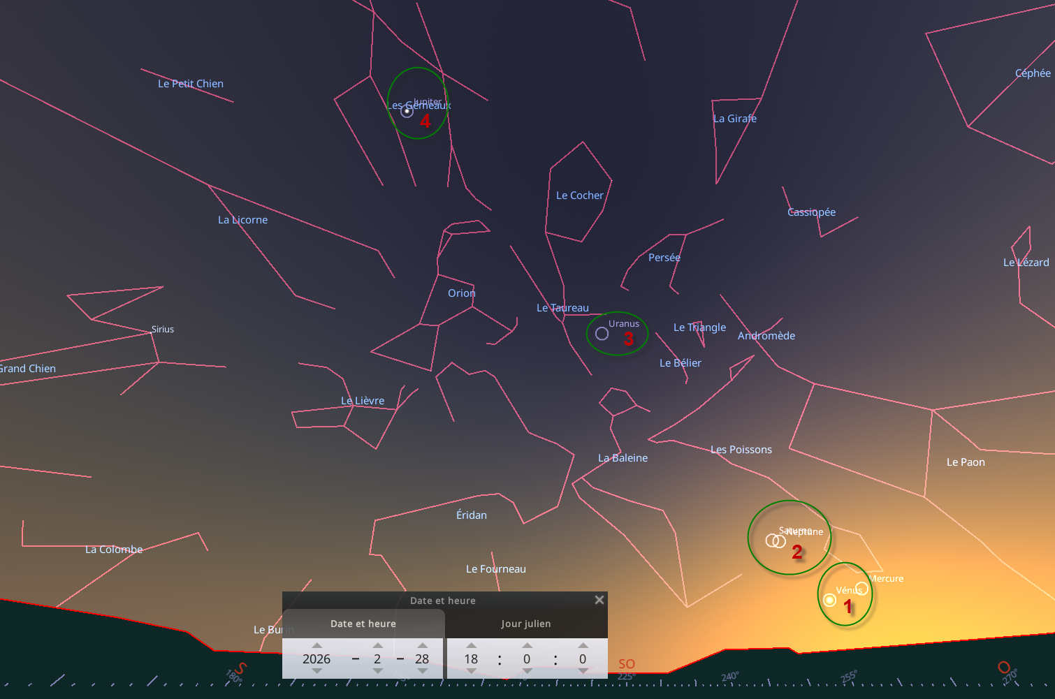 1- Vénus et Mercure, 2- Saturne et Neptune, 3- Uranus, 4- Jupiter