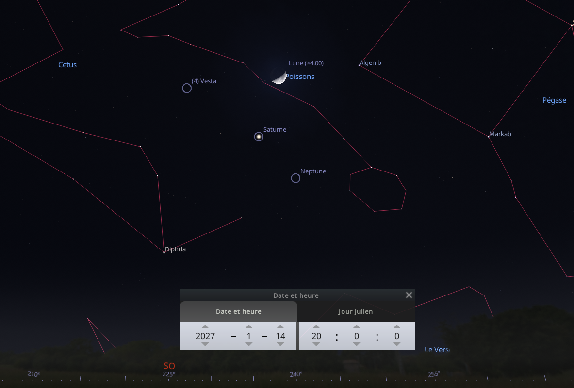 Le jeudi 14 janvier en début de nuit, rapprochement entre la Lune, l’astéroide Vesta et les planètes Saturne et Neptune.