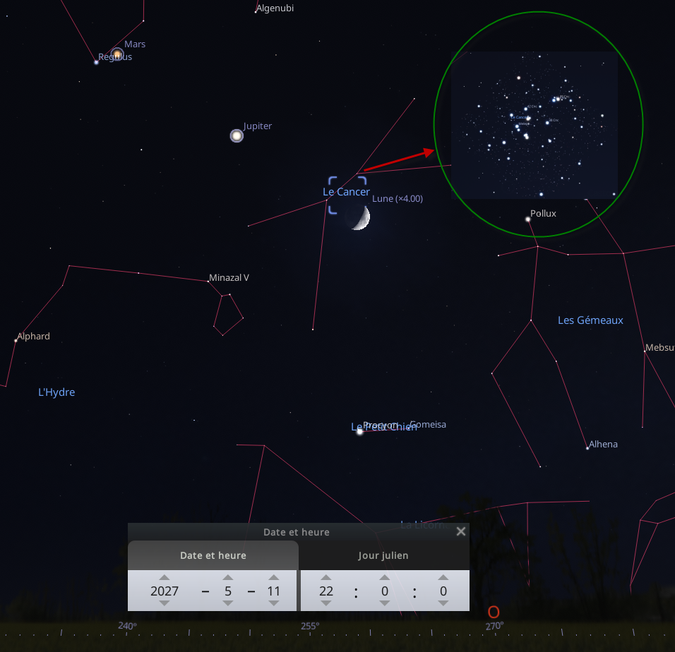 Le mardi 11 mai en début de nuit, rapprochement entre la Lune et l’amas de la Crèche (Messier 44).