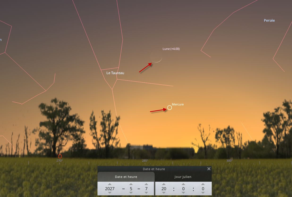 Le vendredi 7 mai après le cocher du Soleil, il y a un rapprochement etre le faible croissant lunaire et la planète Mercure.