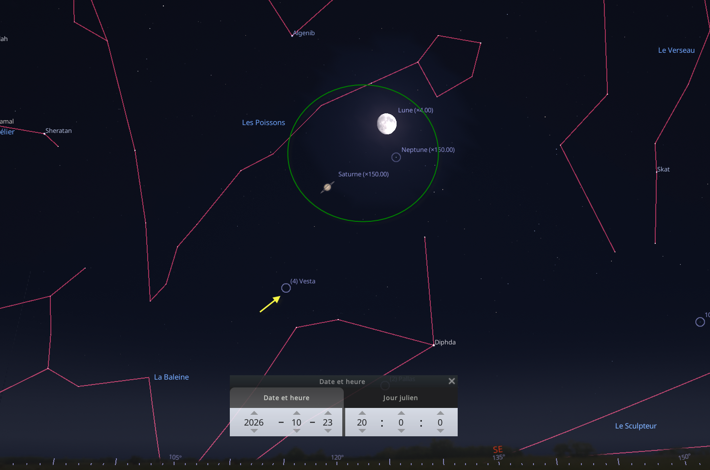 Le vendredi 23 octobre em début de nuit, rapprochement entre la Lune, les planètes géantes Saturne et Neptune. À noter que l’astéroide Vesta se retrouve un peu plus bas.
